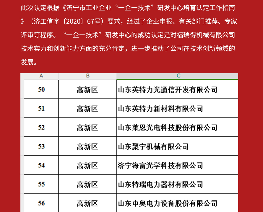 喜報!濟寧市福瑞得機械有限公司被認定為市級工業企業“一企一技術”研發中心